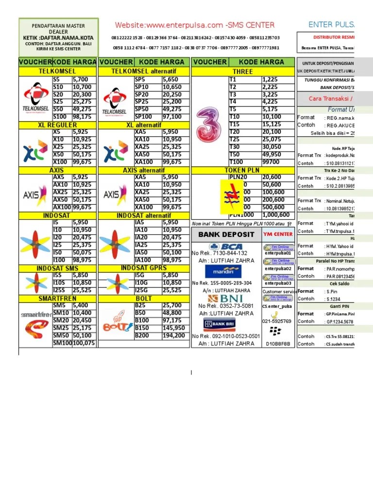 Telkomsel 3 ribu telkomsel 3 ribu: Reguler rp 3.711 reseller rp 3.611: Reguler rp 36 reseller rp 36: Reguler rp 1.676 reseller rp 1.651: Telkomsel isi 5.000 alternatif telkomsel isi 5.000 alternatif: